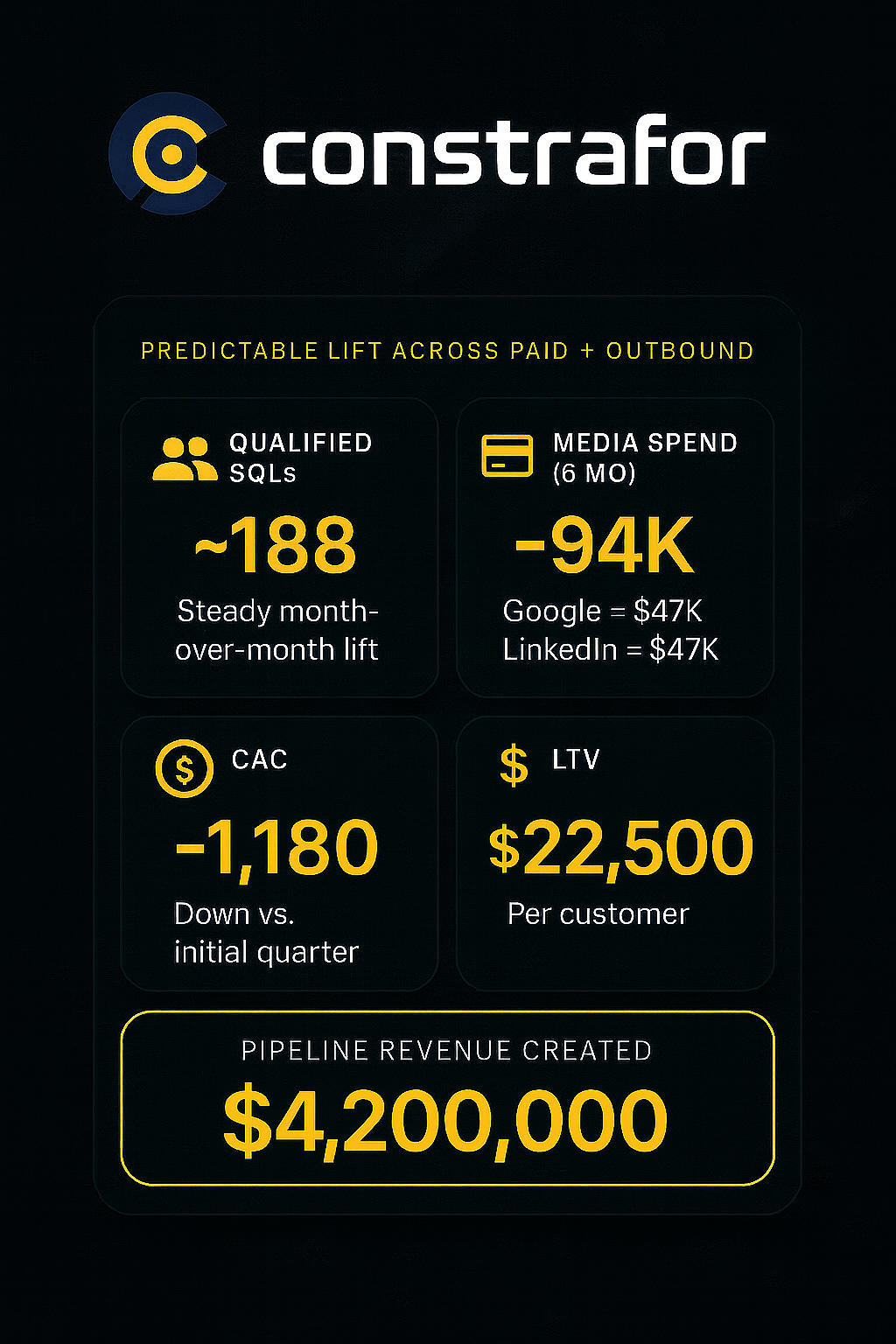 Over 6 months, I installed a predictable GTM engine for Constrafor working with their Marketing Director, turning priority General Contractors & top subcontractors into qualified sales conversations and revenue-ready pipeline. The system combined role-specific messaging, ABM outbound, and paid media