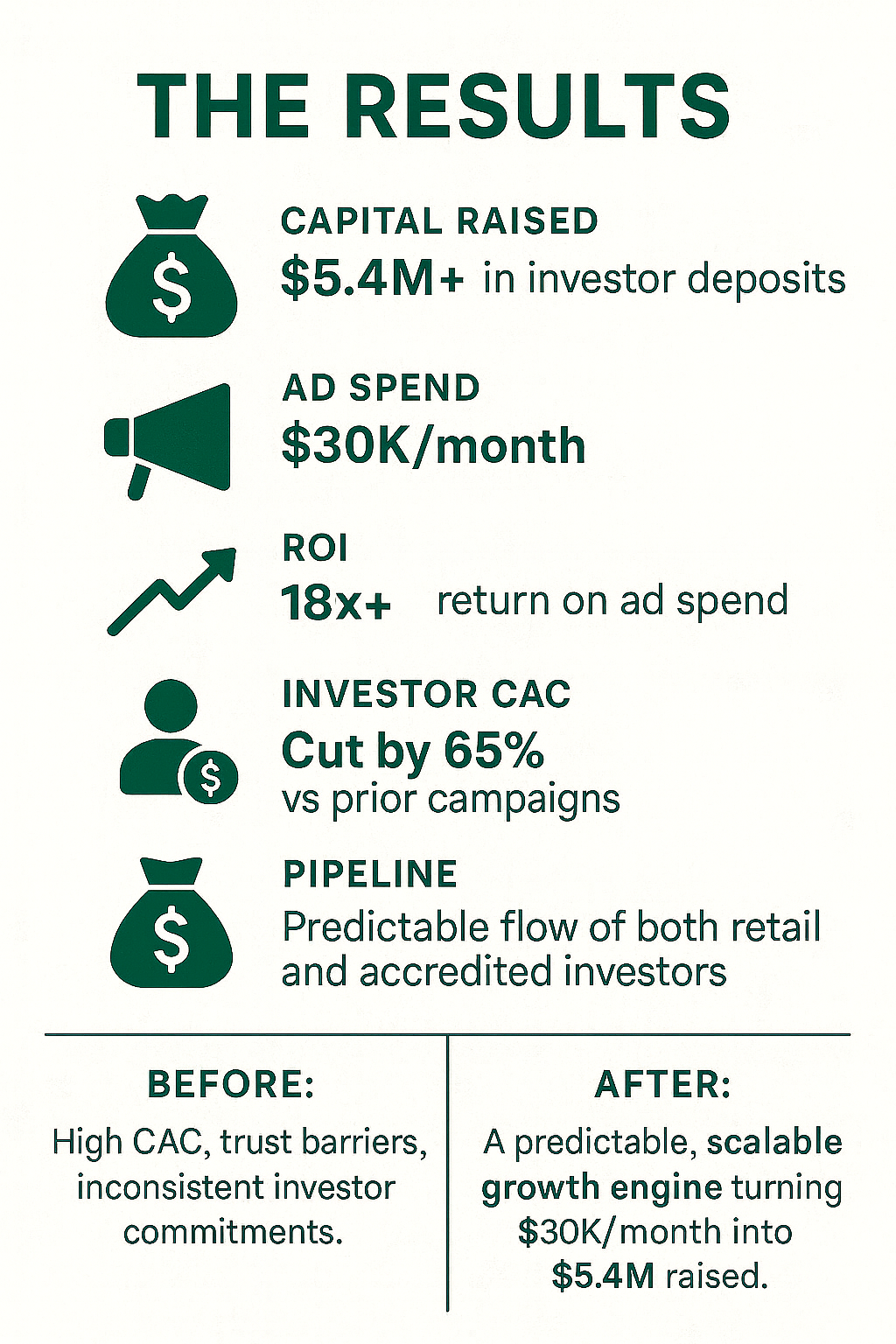 Over 12 months, I worked with Emberfund (via Republic) to fuel a crypto fundraising campaign using a tight, full-funnel engine: paid ads (Meta + LinkedIn), SEO, and lifecycle email. With a $30K/month media budget, we drove 8,000 qualified investor leads and $5.4M raised, while compounding organic reach to lower blended CAC over time (15× ROAS on $360K total paid).