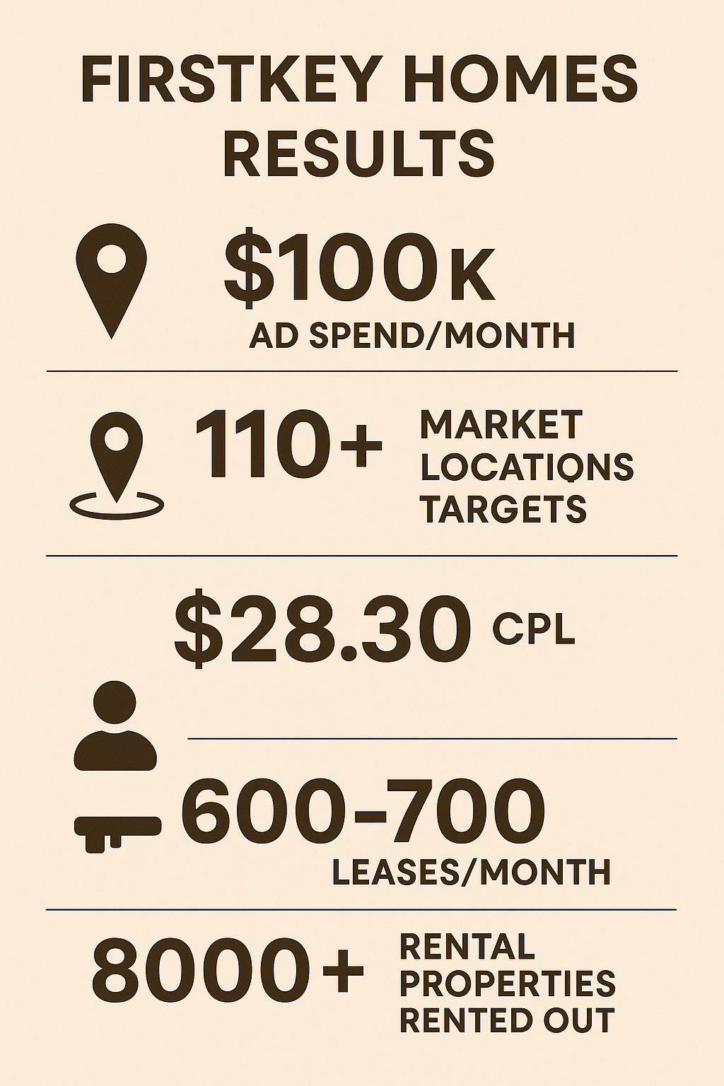 Over 12 months, I worked with the Kool Source, and built a hyper-localized Google Ads engine for FirstKey Homes across 110+ U.S. markets. By pairing market-specific Search with Performance Max (PMax), dynamic landing routes, CPA-targeted bidding, and conversion-grade tracking, we turned fragmented demand into a scalable pipeline: ~3,500 leads/month at $28.30 CPL, converting to ~650–750 leases/month.