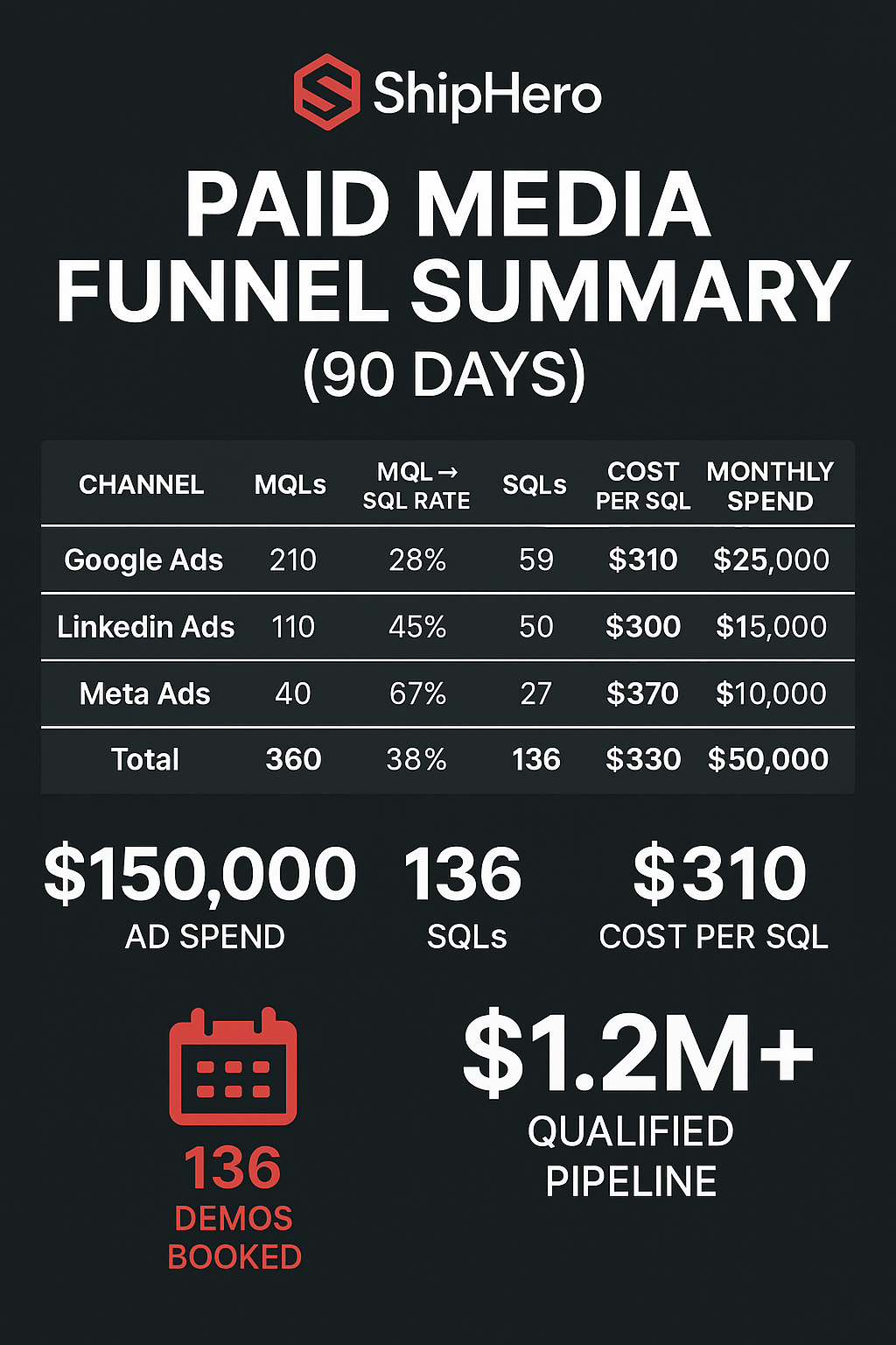 ShipHero, a leading 3PL and eCommerce fulfillment SaaS, wanted to generate more qualified demos and sales opportunities while lowering acquisition costs. Over 90 days, we launched a full-funnel paid media strategy combining Google Ads, LinkedIn Ads, and Meta Ads.